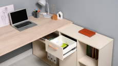 Универсальная сборка позволяет менять стороны расположения тумб и полок, что облегчает интеграцию столов в интерьер любого помещения.