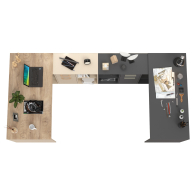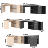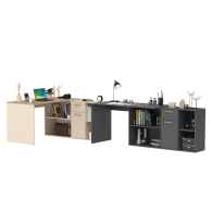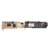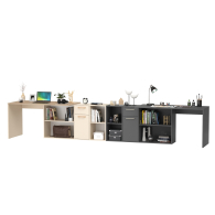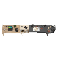 Оба стола могут быть собраны как в прямом, так и в угловом варианте, что позволяет гибко организовать рабочее пространство, максимально адаптируя его под нужды пользователей. Большие, широкие столешницы, толщиной 22 мм, с одной стороны установлены на опоры, а с другой – на вместительные тумбы, каждая из которых располагает боковыми открытыми нишами и центральным отделением с закрытой дверцей и выдвижным ящиком. Обращаем внимание - глубина столешницы стола 03.245F равно 68 см, а стола 03.245.01 - 60 см. Вариативность сборки – это важное преимущество данной модели. Столы могут быть размещены как по прямой, образуя большое рабочее пространство шириной 407,2 см, так и под углом с размером 342,9х136 см.