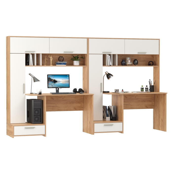 Эти столы не только обеспечат комфортное рабочее пространство для двоих, но и могут заменить компактную стенку в детской комнате или кабинете. Каждый стол обладает широкой столешницей, идеально подходящей для учебы, работы за компьютером или выполнения других задач. Надстройка, расположенная над столешницей, снабжена открытой полкой с перегородками для книг, учебников и других полезных мелочей. Помимо этого, надстройка оснащена закрытыми нишами с откидными фасадами, что позволяет хранить документы и личные вещи в порядке и в пределах легкой доступности. Сбоку каждого стола расположен пенал с тремя полками за распашной дверью, что обеспечивает дополнительное место для хранения. Пенал установлен на тумбу с выдвижным ящиком для канцелярии или мелких принадлежностей. В конструкции предусмотрено открытое пространство сбоку от столешницы, где можно разместить системный блок стационарного компьютера, освобождая место на столе.