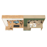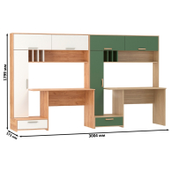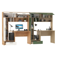 Эти столы не только обеспечат комфортное рабочее пространство для двоих, но и могут заменить компактную стенку в детской комнате или кабинете. Каждый стол обладает широкой столешницей, идеально подходящей для учебы, работы за компьютером или выполнения других задач. Надстройка, расположенная над столешницей, снабжена открытой полкой с перегородками для книг, учебников и других полезных мелочей. Помимо этого, надстройка оснащена закрытыми нишами с откидными фасадами, что позволяет хранить документы и личные вещи в порядке и в пределах легкой доступности. Сбоку каждого стола расположен пенал с тремя полками за распашной дверью, что обеспечивает дополнительное место для хранения. Пенал установлен на тумбу с выдвижным ящиком для канцелярии или мелких принадлежностей. В конструкции предусмотрено открытое пространство сбоку от столешницы, где можно разместить системный блок стационарного компьютера, освобождая место на столе.