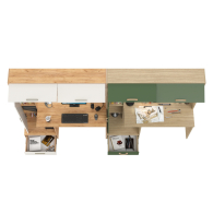 Выполнено в 5-ти комбинированных цветах: дуб крафт золотой/белый премиум/сатин/дымчатый зелёный, дуб крафт золотой/белый премиум/гикори рокфорд натуральный/тёмно-серый, гикори рокфорд натуральный/тёмно-серый/сатин/дымчатый зелёный, дуб крафт золотой/белый премиум/плэйн/сатин и дуб крафт золотой/белый премиум/плэйн/дымчатый зелёный.