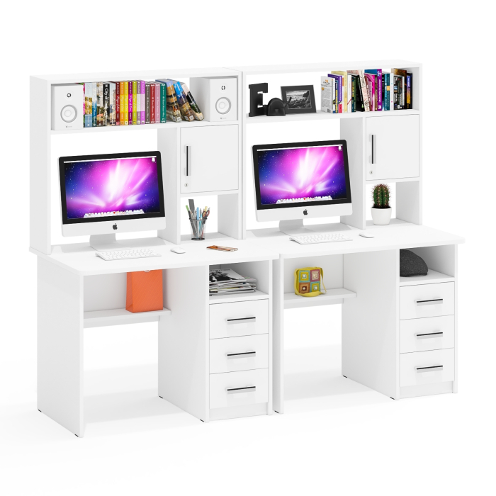 Каждый стол выполнен в классическом компактном варианте, оснащен удобной столешницей, надстройкой с нишей для монитора и тумбой с ящиками. Вместительная столешница легко разместит ноутбук или монитор с клавиатурой, оставляя достаточно места для учебных пособий и канцелярии. Под столешницей расположены две открытые ниши, которые предоставляют удобный доступ к самым важным предметам и место для системного блока. Столы не имеют универсальной сборки - справа у столов расположена тумба с тремя вместительными выдвижными ящиками, для хранения книг, канцелярии и деловых бумаг. Надстройка каждого стола с нишей под монитор диагональю до 27 дюймов (размер ниши 65х70х57 см) обеспечивает безопасность техники и организацию пространства для комфортной работы. Верхняя полка и боковые ниши надстройки отлично подходят для хранения справочников, учебников и других необходимых вещей.