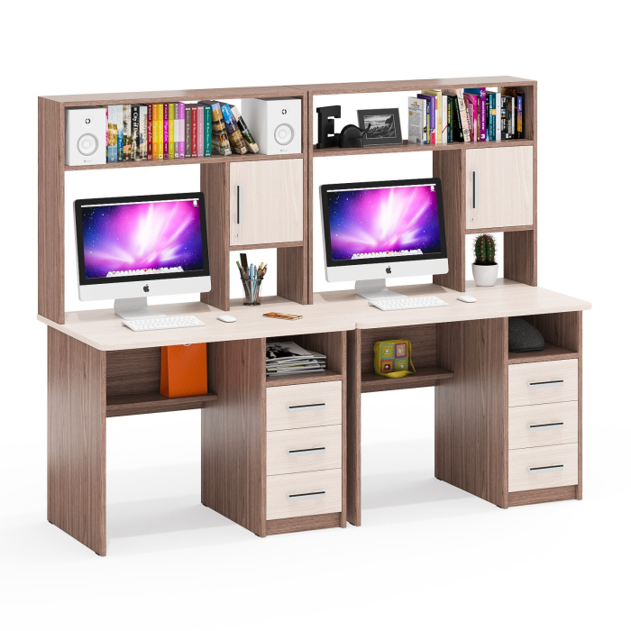 Каждый стол выполнен в классическом компактном варианте, оснащен удобной столешницей, надстройкой с нишей для монитора и тумбой с ящиками. Вместительная столешница легко разместит ноутбук или монитор с клавиатурой, оставляя достаточно места для учебных пособий и канцелярии. Под столешницей расположены две открытые ниши, которые предоставляют удобный доступ к самым важным предметам и место для системного блока. Столы не имеют универсальной сборки - справа у столов расположена тумба с тремя вместительными выдвижными ящиками, для хранения книг, канцелярии и деловых бумаг. Надстройка каждого стола с нишей под монитор диагональю до 27 дюймов (размер ниши 65х70х57 см) обеспечивает безопасность техники и организацию пространства для комфортной работы. Верхняя полка и боковые ниши надстройки отлично подходят для хранения справочников, учебников и других необходимых вещей.
