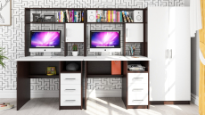 Каждый стол выполнен в классическом компактном варианте, оснащен удобной столешницей, надстройкой с нишей для монитора и тумбой с ящиками. Вместительная столешница легко разместит ноутбук или монитор с клавиатурой, оставляя достаточно места для учебных пособий и канцелярии. Под столешницей расположены две открытые ниши, которые предоставляют удобный доступ к самым важным предметам и место для системного блока. Столы не имеют универсальной сборки - справа у столов расположена тумба с тремя вместительными выдвижными ящиками, для хранения книг, канцелярии и деловых бумаг. Надстройка каждого стола с нишей под монитор диагональю до 27 дюймов (размер ниши 65х70х57 см) обеспечивает безопасность техники и организацию пространства для комфортной работы. Верхняя полка и боковые ниши надстройки отлично подходят для хранения справочников, учебников и других необходимых вещей.