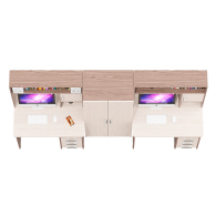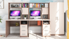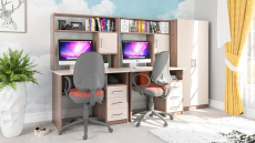 Каждый стол выполнен в классическом компактном варианте, оснащен удобной столешницей, надстройкой с нишей для монитора и тумбой с ящиками. Вместительная столешница легко разместит ноутбук или монитор с клавиатурой, оставляя достаточно места для учебных пособий и канцелярии. Под столешницей расположены две открытые ниши, которые предоставляют удобный доступ к самым важным предметам и место для системного блока. Столы не имеют универсальной сборки - справа у столов расположена тумба с тремя вместительными выдвижными ящиками, для хранения книг, канцелярии и деловых бумаг. Надстройка каждого стола с нишей под монитор диагональю до 27 дюймов (размер ниши 65х70х57 см) обеспечивает безопасность техники и организацию пространства для комфортной работы. Верхняя полка и боковые ниши надстройки отлично подходят для хранения справочников, учебников и других необходимых вещей.