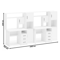 Каждый стол выполнен в классическом компактном варианте, оснащен удобной столешницей, надстройкой с нишей для монитора и тумбой с ящиками. Вместительная столешница легко разместит ноутбук или монитор с клавиатурой, оставляя достаточно места для учебных пособий и канцелярии. Под столешницей расположены две открытые ниши, которые предоставляют удобный доступ к самым важным предметам и место для системного блока. Столы не имеют универсальной сборки - справа у столов расположена тумба с тремя вместительными выдвижными ящиками, для хранения книг, канцелярии и деловых бумаг. Надстройка каждого стола с нишей под монитор диагональю до 27 дюймов (размер ниши 65х70х57 см) обеспечивает безопасность техники и организацию пространства для комфортной работы. Верхняя полка и боковые ниши надстройки отлично подходят для хранения справочников, учебников и других необходимых вещей.