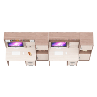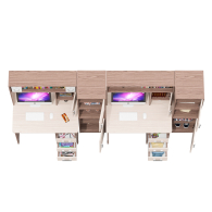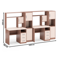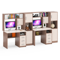 Каждый стол выполнен в классическом компактном варианте, оснащен удобной столешницей, надстройкой с нишей для монитора и тумбой с ящиками. Вместительная столешница легко разместит ноутбук или монитор с клавиатурой, оставляя достаточно места для учебных пособий и канцелярии. Под столешницей расположены две открытые ниши, которые предоставляют удобный доступ к самым важным предметам и место для системного блока. Столы не имеют универсальной сборки - справа у столов расположена тумба с тремя вместительными выдвижными ящиками, для хранения книг, канцелярии и деловых бумаг. Надстройка каждого стола с нишей под монитор диагональю до 27 дюймов (размер ниши 65х70х57 см) обеспечивает безопасность техники и организацию пространства для комфортной работы. Верхняя полка и боковые ниши надстройки отлично подходят для хранения справочников, учебников и других необходимых вещей.