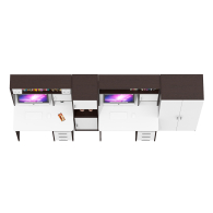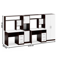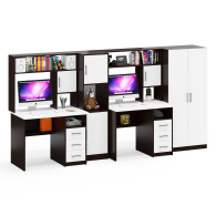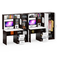 Каждый стол выполнен в классическом компактном варианте, оснащен удобной столешницей, надстройкой с нишей для монитора и тумбой с ящиками. Вместительная столешница легко разместит ноутбук или монитор с клавиатурой, оставляя достаточно места для учебных пособий и канцелярии. Под столешницей расположены две открытые ниши, которые предоставляют удобный доступ к самым важным предметам и место для системного блока. Столы не имеют универсальной сборки - справа у столов расположена тумба с тремя вместительными выдвижными ящиками, для хранения книг, канцелярии и деловых бумаг. Надстройка каждого стола с нишей под монитор диагональю до 27 дюймов (размер ниши 65х70х57 см) обеспечивает безопасность техники и организацию пространства для комфортной работы. Верхняя полка и боковые ниши надстройки отлично подходят для хранения справочников, учебников и других необходимых вещей.