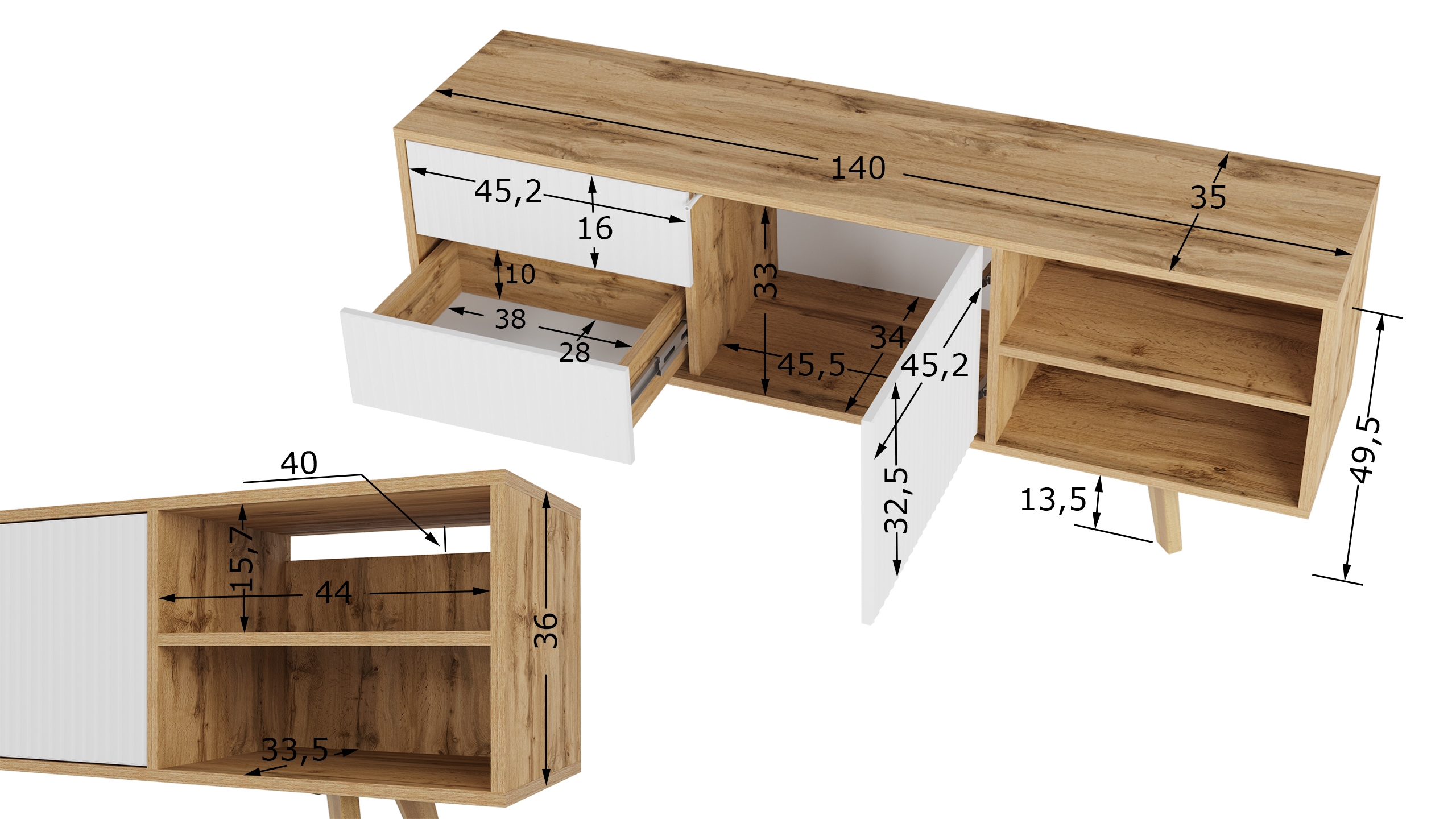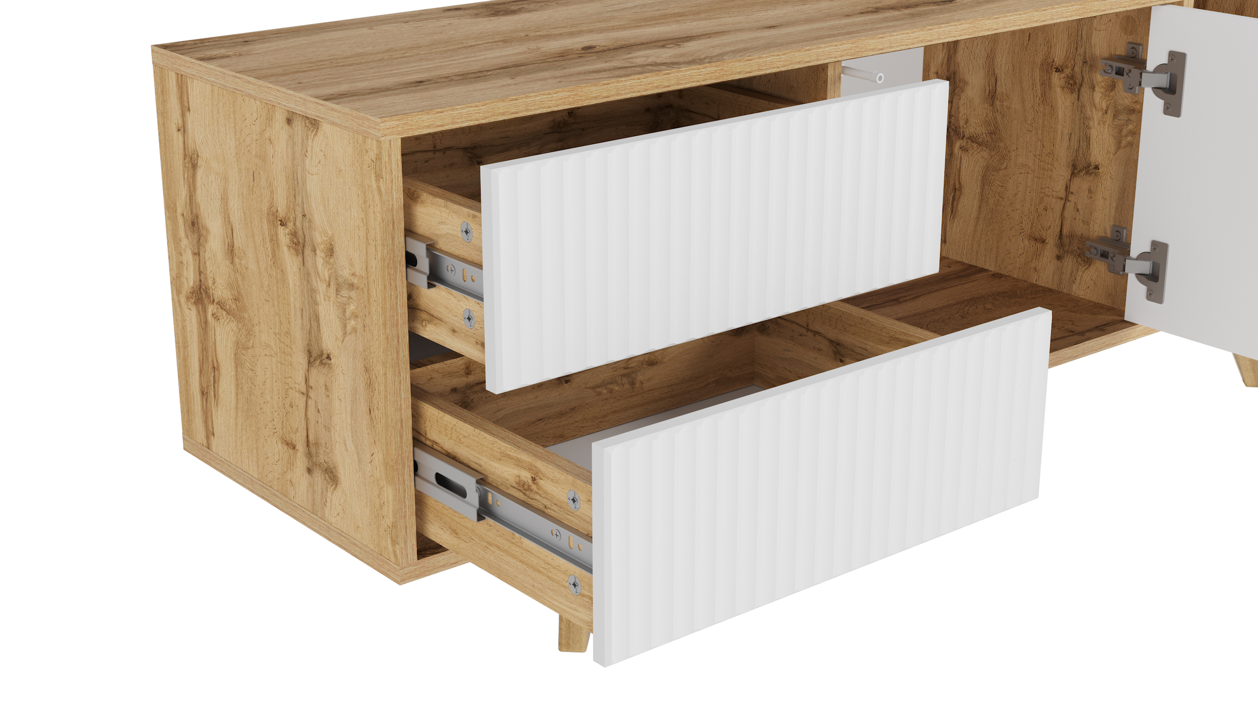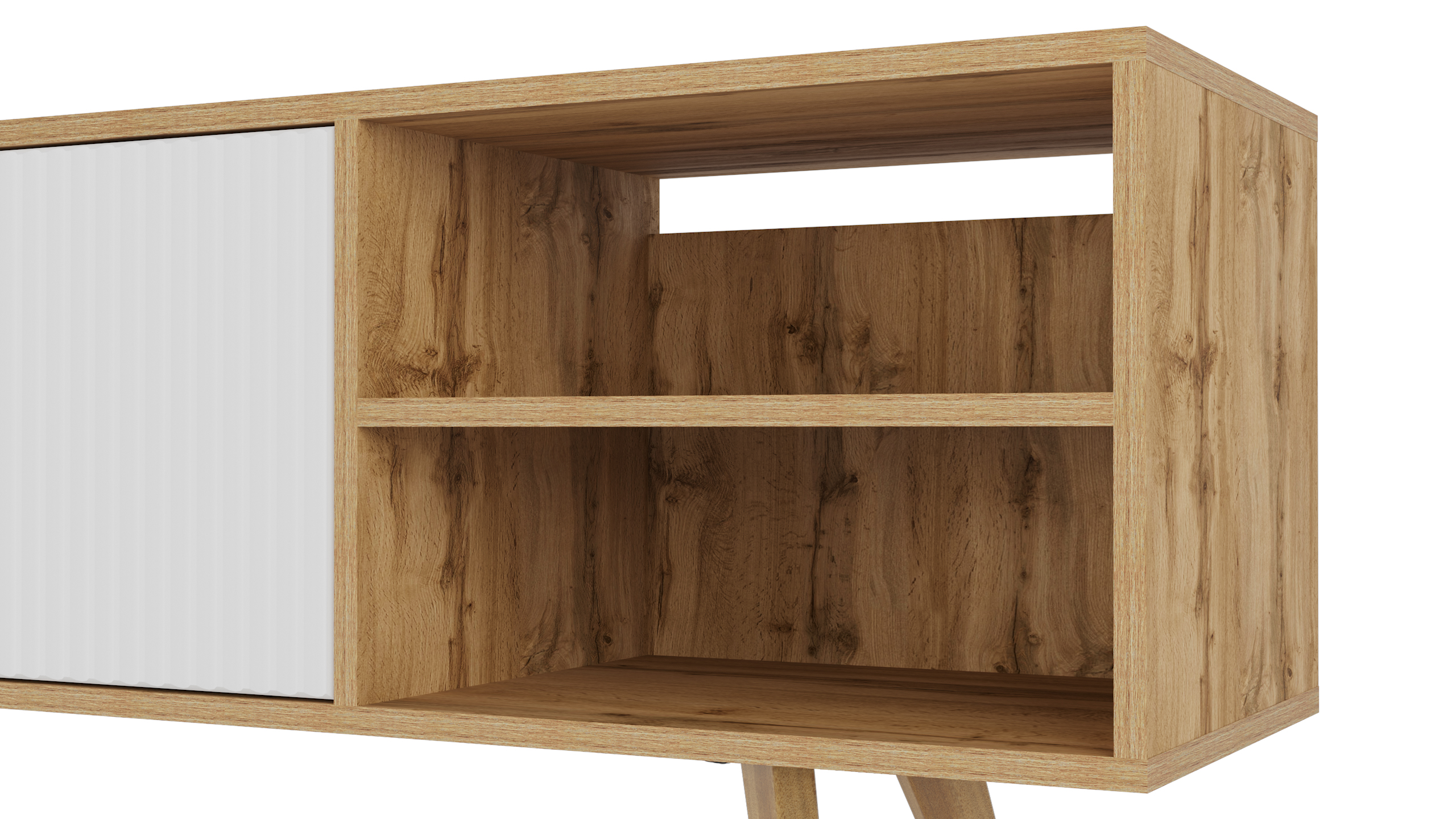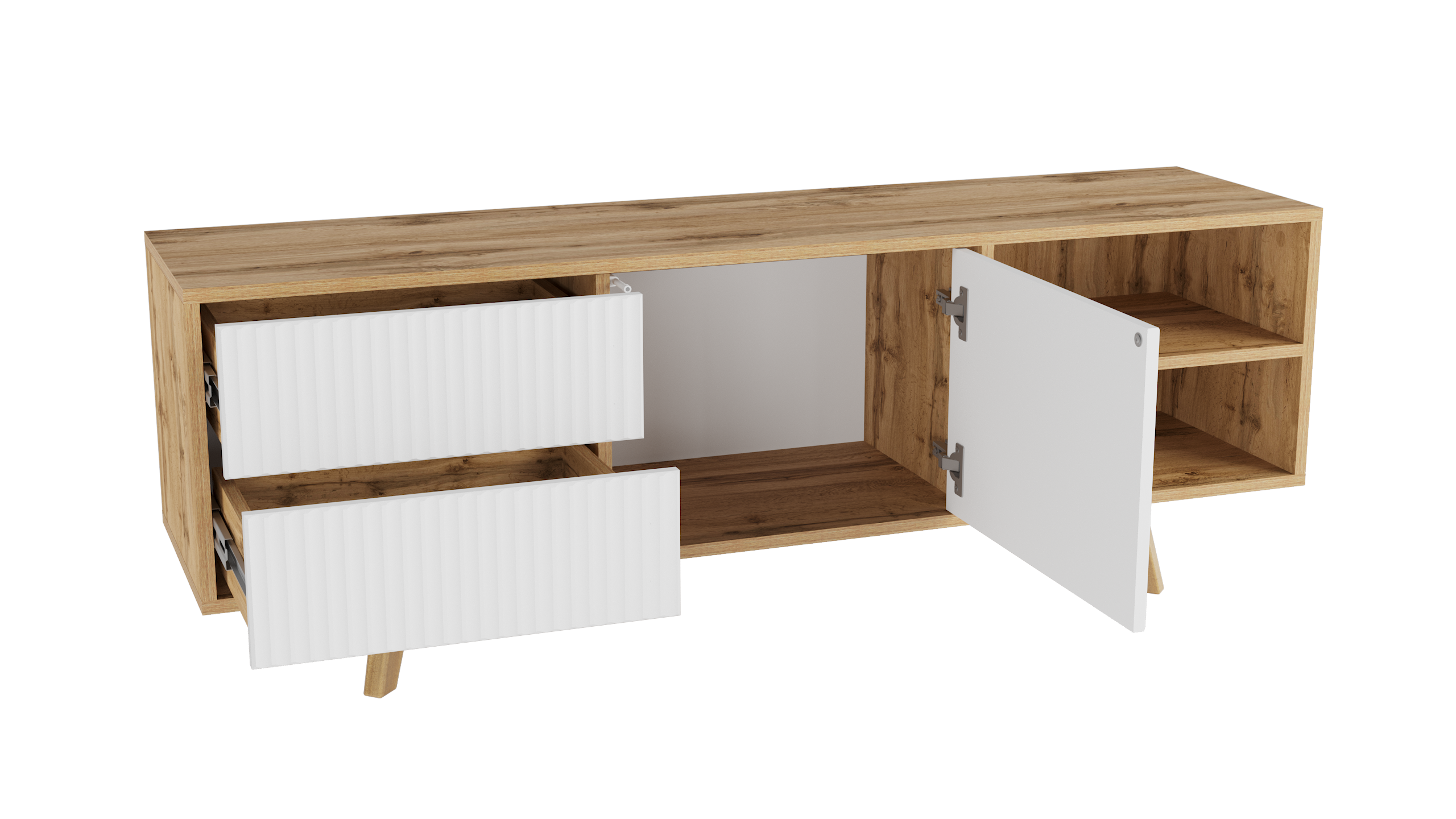 Изготовленная из высококачественных материалов, тумба под телевизор Хагги обладает долговечностью и надёжностью. Она выдерживает значительные нагрузки, что особенно важно при использовании с крупногабаритной техникой. Благодаря тщательно продуманной конструкции, тумба тв на ножках обеспечивает удобное размещение различных электронных устройств, таких как игровые консоли, медиаплееры и другие аксессуары, что делает использование телевизора ещё более комфортным. В тумбе предусмотрено несколько отделений и полок, которые помогут вам организовать порядок и избежать беспорядка в интерьере.