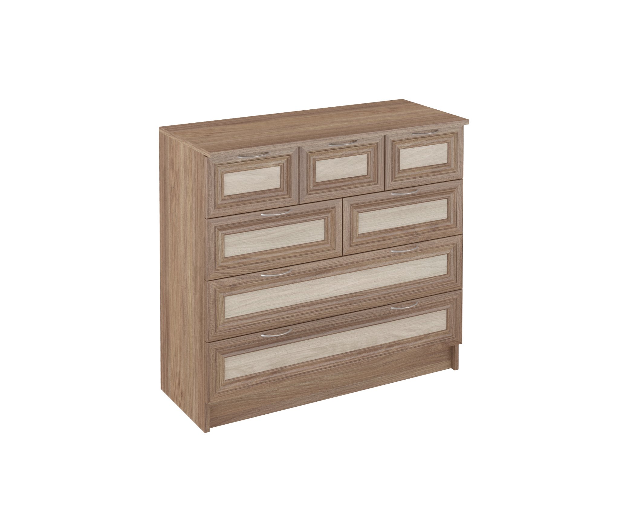 Комод 21 отличается большими размерами и многофункциональностью в использовании.Два нижних ящика больших размеров,остальные 5 размером меньше,что позволяет размещать вещи разной габаритности.Корпус ЛДСП,фасады рамочные МДФ.Производитель оставляет за собой право менять фурнитуру.