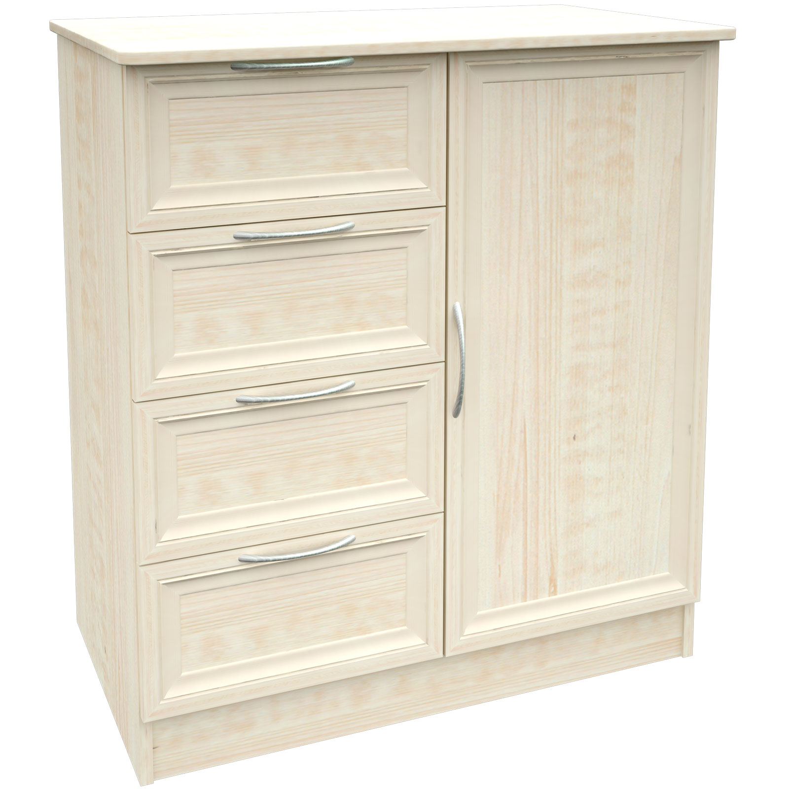 Комод 4 не больших размеров по ширине,состоит из 4-х выдвижных ящиков+дверь,скрывающая полку.Удобен в использовании.Производитель оставляет за собой право менять фурнитуру.