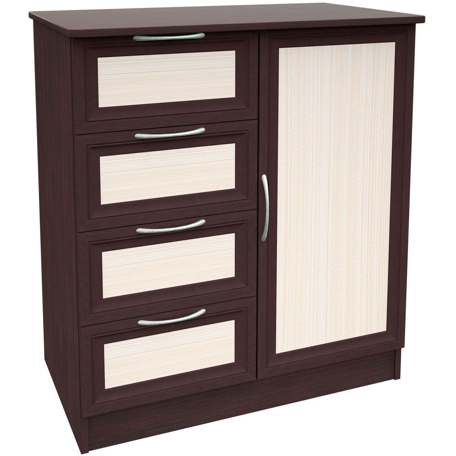 Комод 4 не больших размеров по ширине,состоит из 4-х выдвижных ящиков+дверь,скрывающая полку.Удобен в использовании.Производитель оставляет за собой право менять фурнитуру.