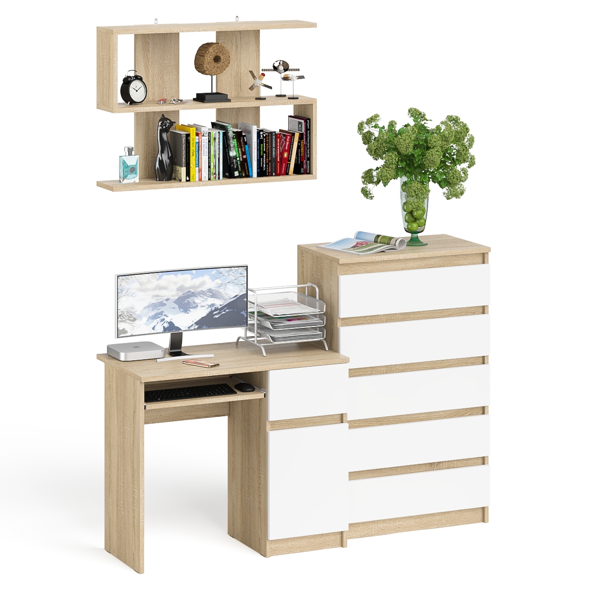 Комплектация включает стол Мори МС-1 правый компьютерный, узкий комод пять ящиков Мори МК700.5 и навесную полку Плк-900.
