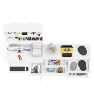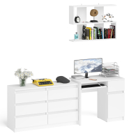 Комплектация включает стол Мори МС-1 правый компьютерный, широкий комод шесть ящиков Мори МК1200.6 и навесную полку Плк-900.