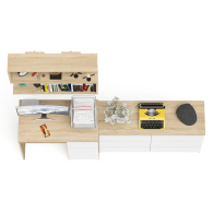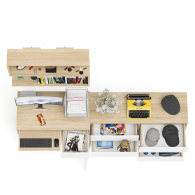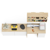 Комплектация включает стол Мори МС-1 правый компьютерный, широкий комод шесть ящиков Мори МК1200.6 и навесную полку Плк-900.