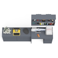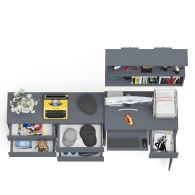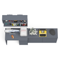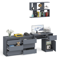 Комплектация включает стол Мори МС-1 правый компьютерный, широкий комод шесть ящиков Мори МК1200.6 и навесную полку Плк-900.