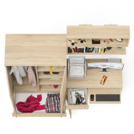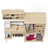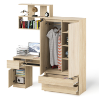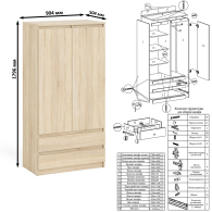 Шкаф-комод Мори МШ900.1 оборудован двумя распашными дверями сверху и двумя выдвижными ящиками снизу. За дверями расположены два отделения с одной стороны с горизонтальной штангой (420 мм) для одежды на плечиках, с другой с тремя полками. Открывание ящиков и дверей производится за счет пространства между планками и фасадами. Выдвижные ящики на роликовых направляющих L=350 и 400 мм. неполного выдвижения обеспечивают комфортную эксплуатацию.