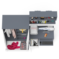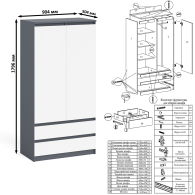 Шкаф-комод Мори МШ900.1 оборудован двумя распашными дверями сверху и двумя выдвижными ящиками снизу. За дверями расположены два отделения с одной стороны с горизонтальной штангой (420 мм) для одежды на плечиках, с другой с тремя полками. Открывание ящиков и дверей производится за счет пространства между планками и фасадами. Выдвижные ящики на роликовых направляющих L=350 и 400 мм. неполного выдвижения обеспечивают комфортную эксплуатацию.