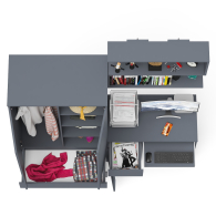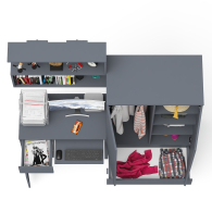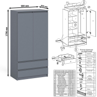Шкаф-комод Мори МШ900.1 оборудован двумя распашными дверями сверху и двумя выдвижными ящиками снизу. За дверями расположены два отделения с одной стороны с горизонтальной штангой (420 мм) для одежды на плечиках, с другой с тремя полками. Открывание ящиков и дверей производится за счет пространства между планками и фасадами. Выдвижные ящики на роликовых направляющих L=350 и 400 мм. неполного выдвижения обеспечивают комфортную эксплуатацию.