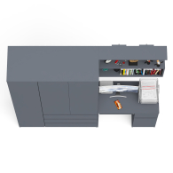 Продуманная конструкция позволяет убрать лишние предметы, тем самым сохраняя единый стиль оформления помещения. Отсутствие ручек главное преимущество данной модели. Роль ручек выполняют сами фасады.