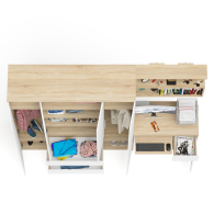 Шкаф-комод с тремя ящиками и четырьмя дверками Мори МШ1600.1 - вместительная система хранения. Оборудован тремя отделениями. Центральное сверху за распашными дверьми с тремя полками и снизу тремя выдвижными ящиками. По бокам расположены два отделения с горизонтальными штангами (2х372 мм.) для одежды на плечиках, антресольной полкой и нижней нишей в каждом. Открывание ящиков и малых дверей производится за счет пространства между планками и фасадами. Выдвижные ящики на роликовых направляющих L=400 мм. неполного выдвижения обеспечивают комфортную эксплуатацию. Открывание высоких створок дверей шкафа производится за счет системы Push-to-open - простым нажатием на фасад.