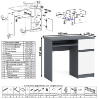 Особенности: ящик справа, выдвижная полка для клавиатуры.