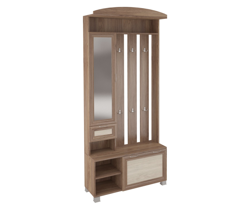 Корпус прихожей выполнен из Ламинированной ДСП высшего качества с насыщенным цветом. Фасады выполнены из материала МДФ и дополнительно укреплены металлическими скобами и силиконом изнутри. Шириною 95 см., данная прихожая похожа на седьмую модель, только без шкафа, разработана специально для тех кому он не нужен. Имеется узкое зеркало над ящиком, а снизу секция за откидной дверцей. Так же есть 5 двойных крючков на вешалке, как и на других моделях. Модель идеально подходит как для не больших помещений.