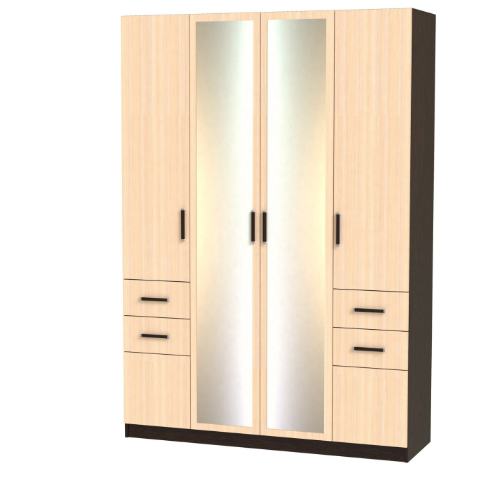 Феникс М-14 Корпус шкафа выполнен из Ламинированной ДСП высшего качества с насыщенным цветом. В данной моделе используются зеркала.Шириною 160 см., красивый четырехстворчатый шкаф. В центре 2 большие двери с зеркалами, за ними расположено большое отделение со штангой. Слева Ниша с небольшой штангой и ещё одна маленькая для сложенных вещей. Справа четыре таких же ниши. Внизу симметрично с каждой стороны располагается по два выдвижных ящика и по одному отделению закрытому на небольшую дверцу. Зеркала входят в стоимость шкафа.