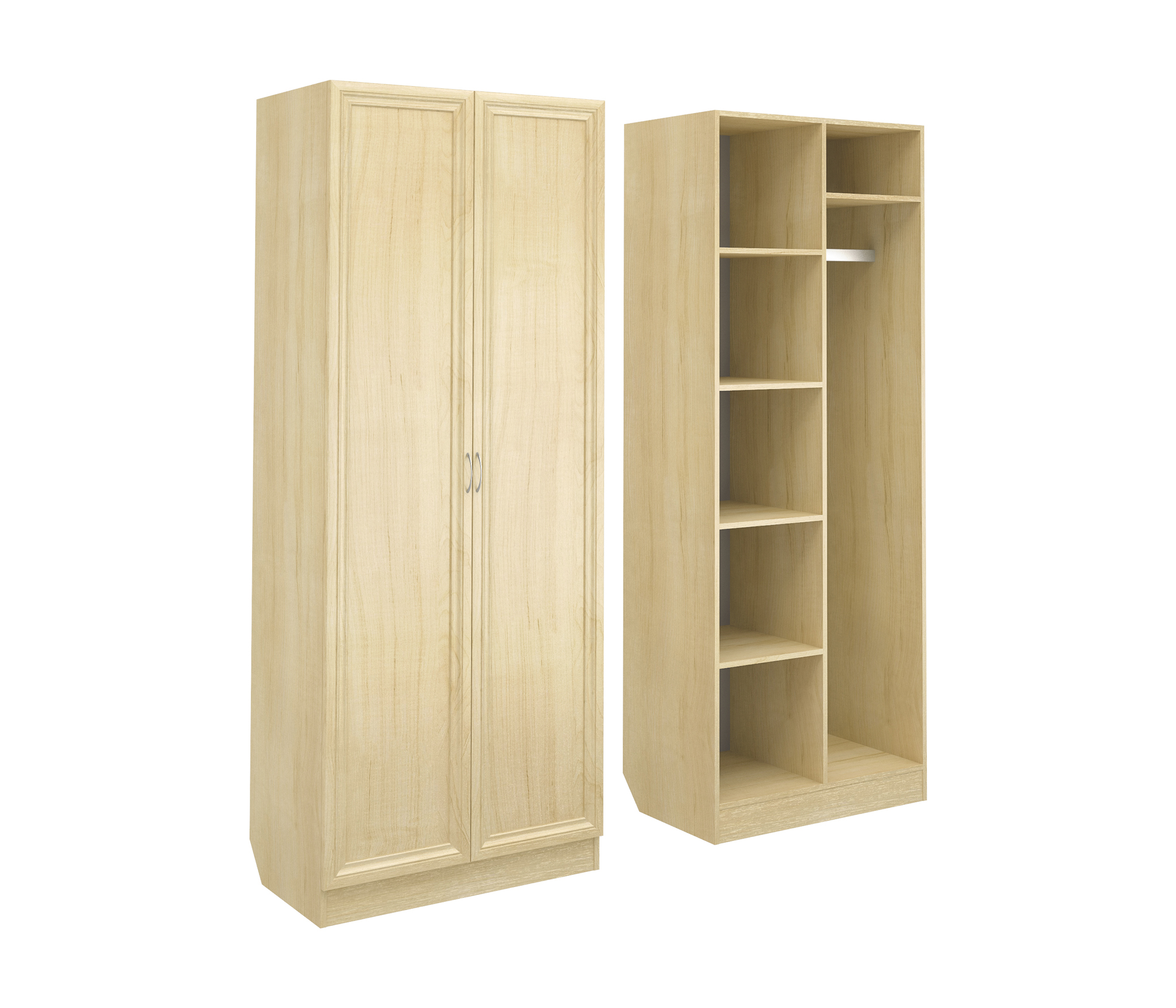 Корпус шкафа выполнен из Ламинированной ДСП высокого качества с насыщенным цветом. Фасады выполнены из материала МДФ.Шириною 80 см., это классический шкаф для верхней одежды, несет в себе следующие элементы. За распашными дверьми с одной стороны отделение с четырьмя полками, с другой штанга для одежды и узкая ниша над ней.