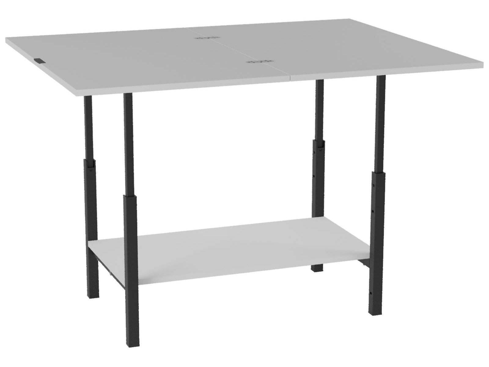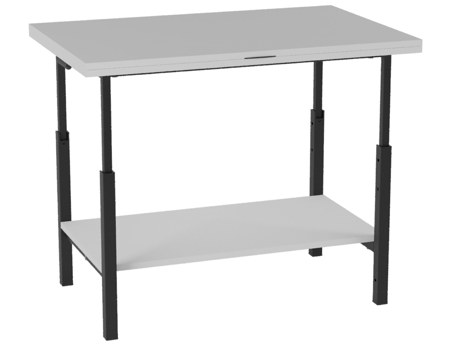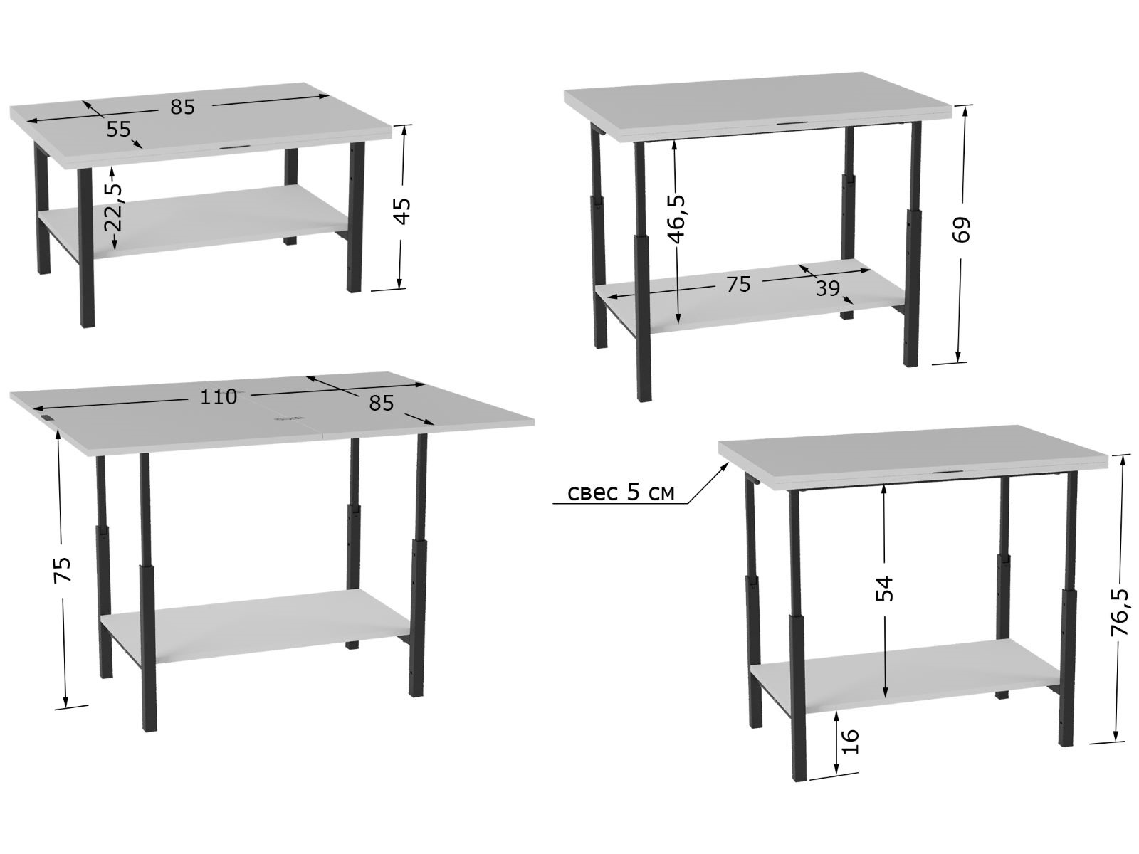 Стол имеет три положения по высоте: 45см, 69 см, 76,5 см. Столешница раскладывается на всех высотах.