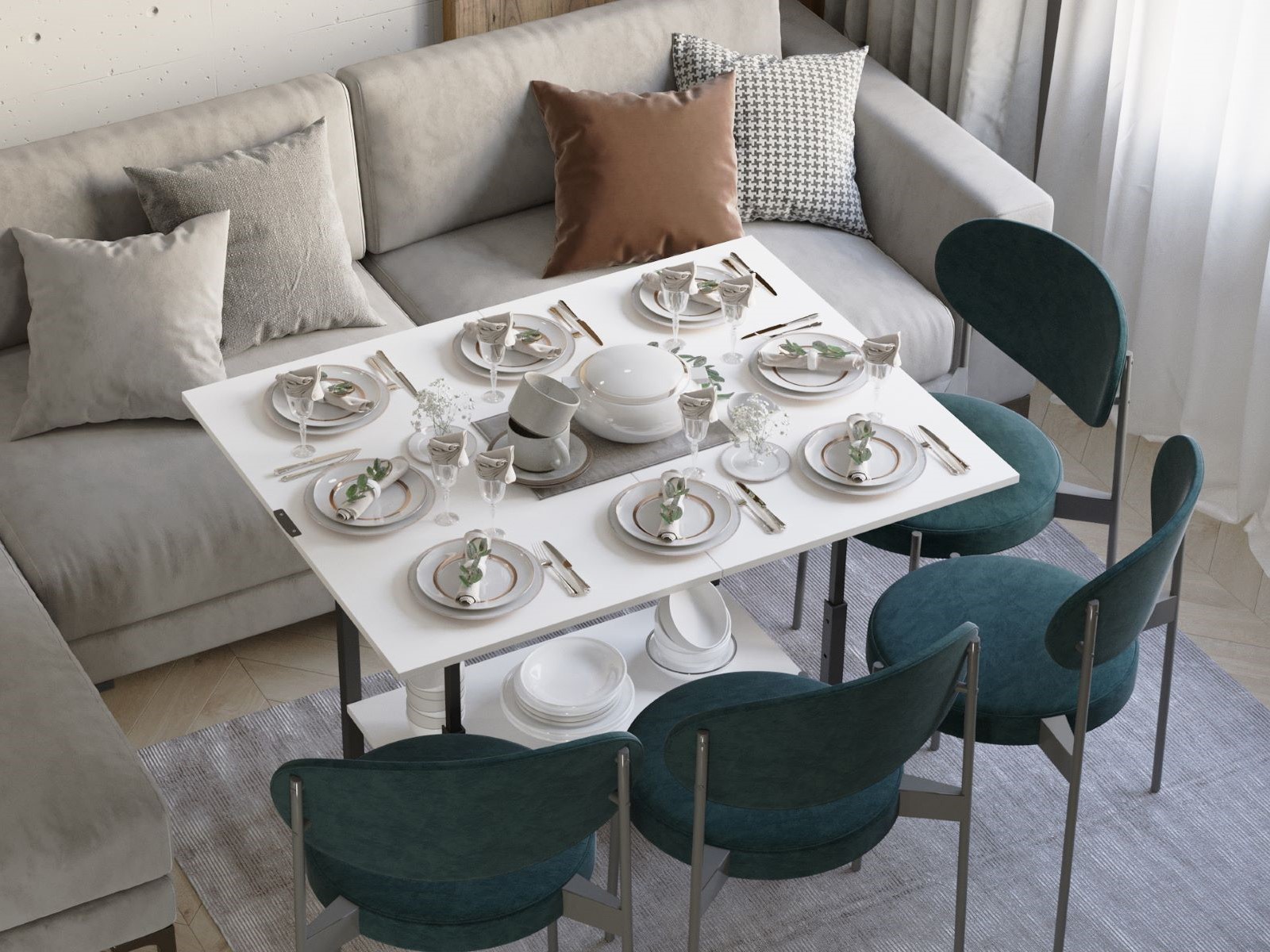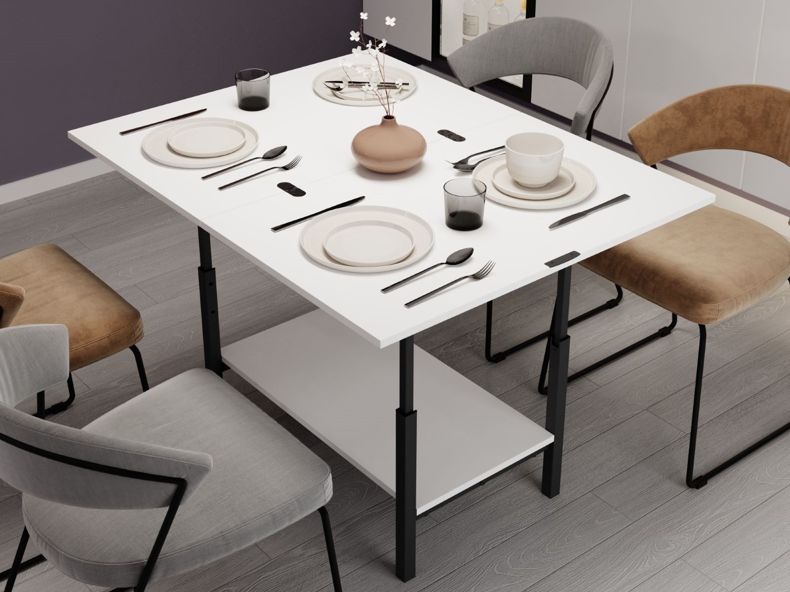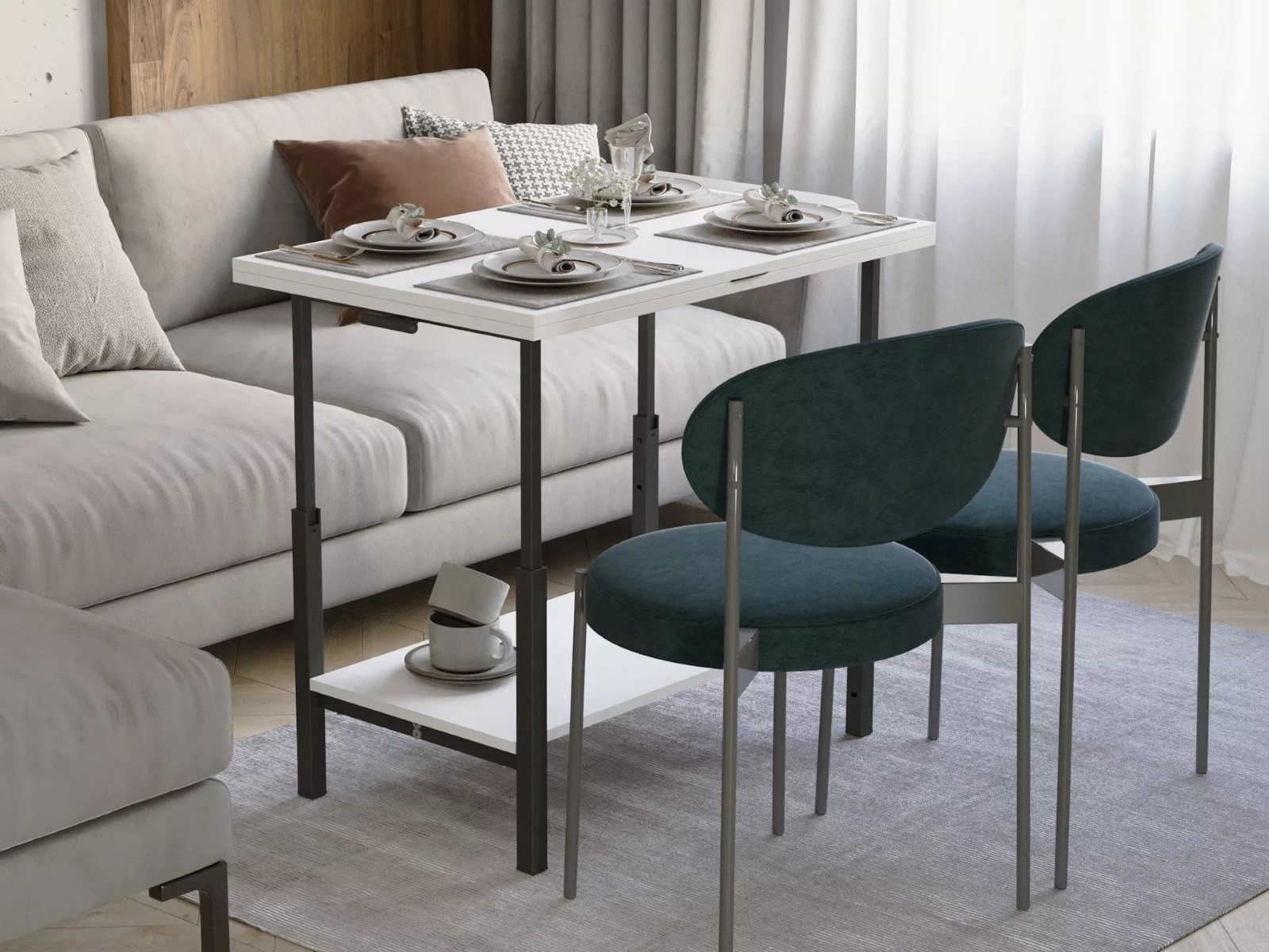 Легкий и компактный, стол трансформер легко перемещается, что позволяет использовать его в разных зонах: в гостиной, спальне или даже на даче. Кроме того, это отличное решение для гостей, когда необходимо создать дополнительное место для сервировки или размещения напитков.