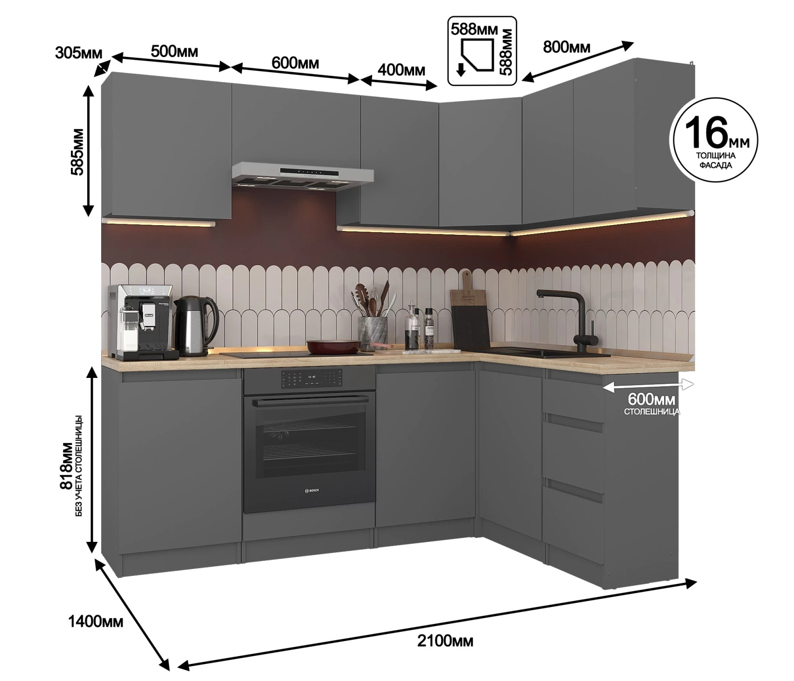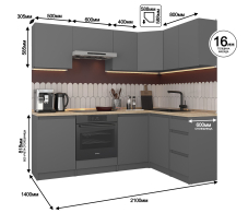 Размеры угловой кухни 2,1х1,4 м. она идеально подходит для помещений с ограниченным пространством.