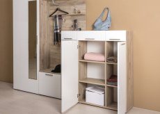 Распашной шкаф Лайн — стильная и компактная модель, с помощью которой легко организовать удобное пространство для хранения. Верхнюю одежду можно аккуратно повесить в нишу с поперечной штангой, а для обуви и других вещей есть две небольшие полочки.
