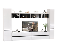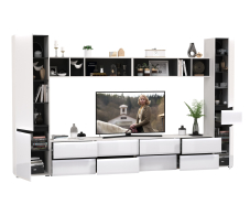 Комплектация состоит из двух тумб под ТВ Сидней 13.63, двух полок Сидней 15.57, шкафа с дверками Сидней 13.200 и узкого шкафа с ящиком Сидней 13.202.