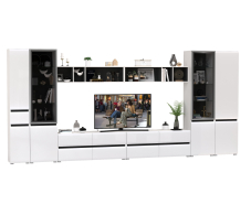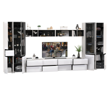 Комплектация состоит из двух тумб под ТВ Сидней 13.63, двух полок Сидней 15.57, шкафа с дверками Сидней 13.200, шкафов с фасадами стекло Сидней 13.201 и узкого шкафа с ящиком Сидней 13.202.