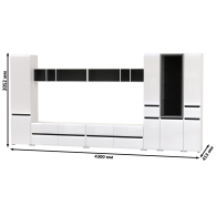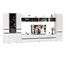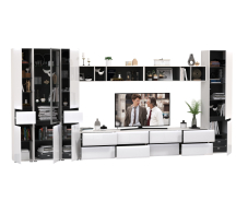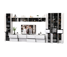 Комплектация состоит из двух тумб под ТВ Сидней 13.63, двух полок Сидней 15.57, шкафа с дверками Сидней 13.200, шкафа с фасадами стекло Сидней 13.201 и двух узких шкафов с ящиком Сидней 13.202.