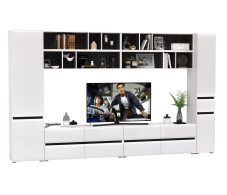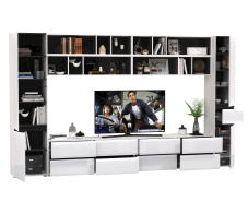 Комплектация состоит из двух тумб под ТВ Сидней 13.63, четырех полок Сидней 15.57, шкафа с дверками Сидней 13.200 и узкого шкафа с ящиком Сидней 13.202.