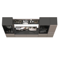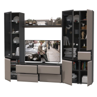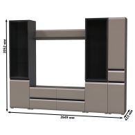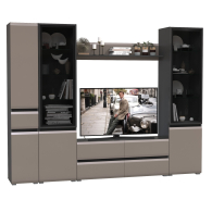 Комплектация состоит из тумбы под ТВ Сидней 13.63, полки открытой Сидней 16.486, двух шкафов с фасадами стекло Сидней 13.201 и узкого шкафа с ящиком Сидней 13.202.