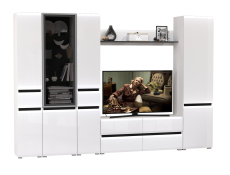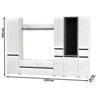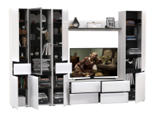 Комплектация состоит из тумбы под ТВ Сидней 13.63, полки открытой Сидней 16.486, шкафа с дверками Сидней 13.200, шкафа с фасадами стекло Сидней 13.201 и двух узких шкафов с ящиком Сидней 13.202.