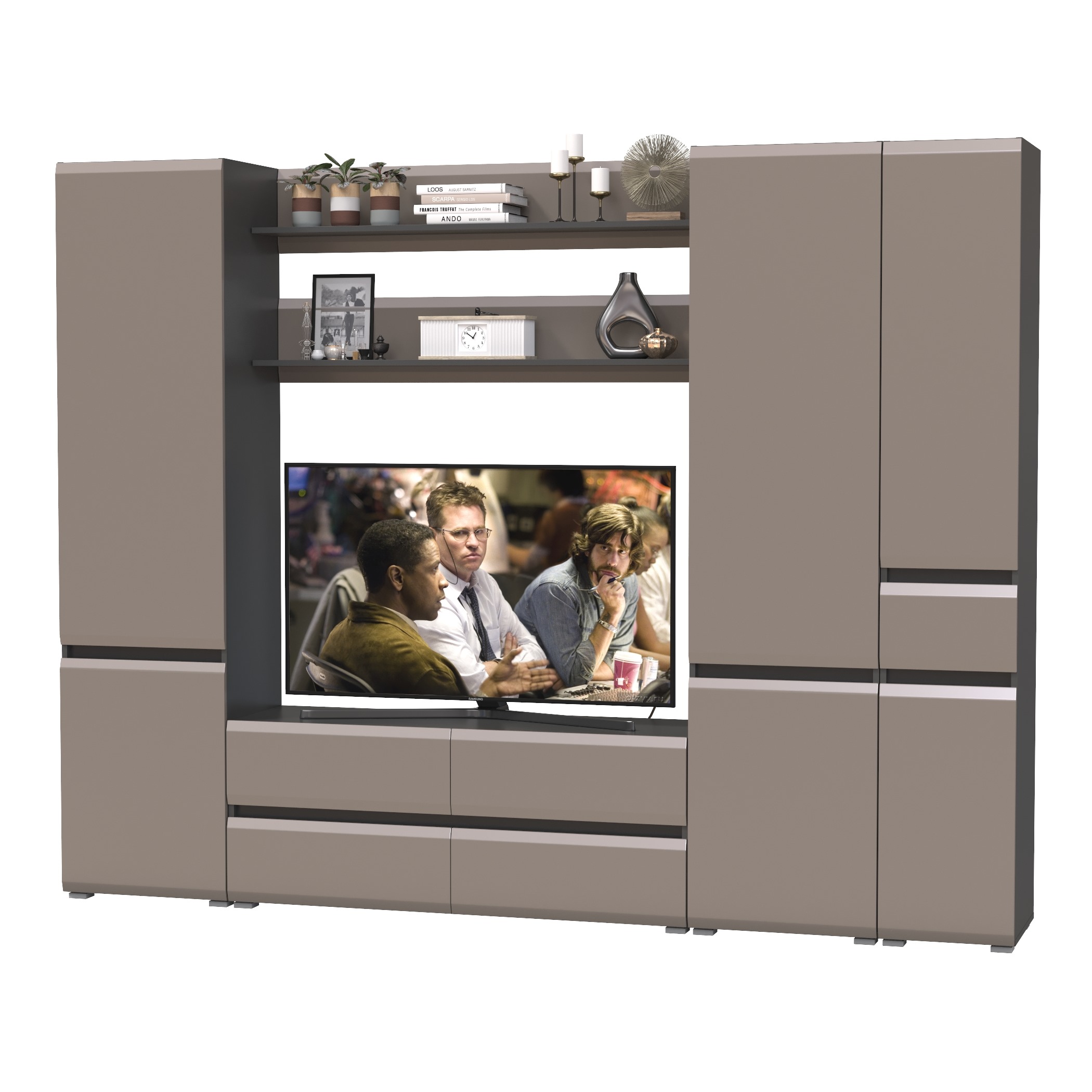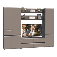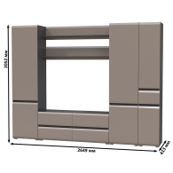 Комплектация состоит из тумбы под ТВ Сидней 13.63, двух полок открытых Сидней 16.486, двух шкафов с дверками Сидней 13.200 и узкого шкафа с ящиком Сидней 13.202.