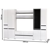 Комплектация состоит из тумбы под ТВ Сидней 13.63, двух полок открытых Сидней 16.486, шкафа с дверками Сидней 13.200, шкафа с фасадами стекло Сидней 13.201 и двух узких шкафов с ящиком Сидней 13.202.