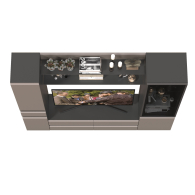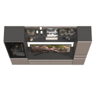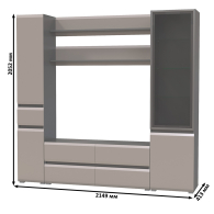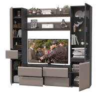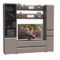 Комплектация состоит из тумбы под ТВ Сидней 13.63, двух полок открытых Сидней 16.486, шкафа с фасадами стекло Сидней 13.201 и узкого шкафа с ящиком Сидней 13.202.