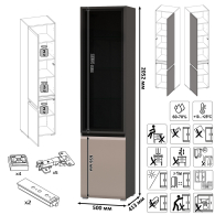 Корпус мебели изготовлен из прочной ламинированной ДСП 16 мм, торцы деталей закромлены плёнкой ПВХ 0,4 мм. Фасады выполнены из ламинированной МДФ 16 мм и прозрачного стекла с серой тонировкой. Поставляется в разобранном виде, надёжно упакованной в гофрокартон, с приложенной подробной инструкцией по сборке.