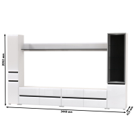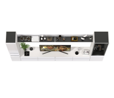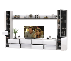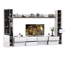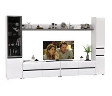 Комплектация состоит из двух тумб под ТВ Сидней 13.63, двух полок открытых Сидней 16.486, шкафа с фасадами стекло Сидней 13.201 и узкого шкафа с ящиком Сидней 13.202.
