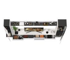 Узкий шкаф Сидней 13.202 состоит из верхнего и нижнего отделений с полками за дверкой и выдвижным ящиком по центру на шариковых направляющих. В верхнем отделении три полки, в нижней 1 полочка. Чёрная задняя стенка эффектно подчеркивает наполнение шкафов.