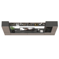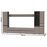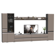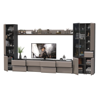 Комплектация состоит из двух тумб под ТВ Сидней 13.63, двух полок открытых Сидней 16.486, шкафа с дверками Сидней 13.200, шкафа с фасадами стекло Сидней 13.201 и узкого шкафа с ящиком Сидней 13.202.