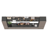Узкий шкаф Сидней 13.202 состоит из верхнего и нижнего отделений с полками за дверкой и выдвижным ящиком по центру на шариковых направляющих. В верхнем отделении три полки, в нижней 1 полочка. Чёрная задняя стенка эффектно подчеркивает наполнение шкафов.