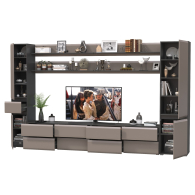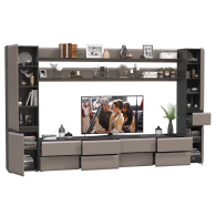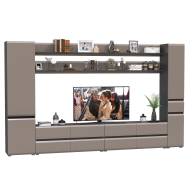 Комплектация состоит из двух тумб под ТВ Сидней 13.63, четырех полок открытых Сидней 16.486, шкафа с дверками Сидней 13.200 и узкого шкафа с ящиком Сидней 13.202.