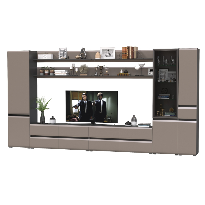 Комплектация состоит из двух тумб под ТВ Сидней 13.63, четырех полок открытых Сидней 16.486, шкафа с дверками Сидней 13.200, шкафа с фасадами стекло Сидней 13.201 и узкого шкафа с ящиком Сидней 13.202.
