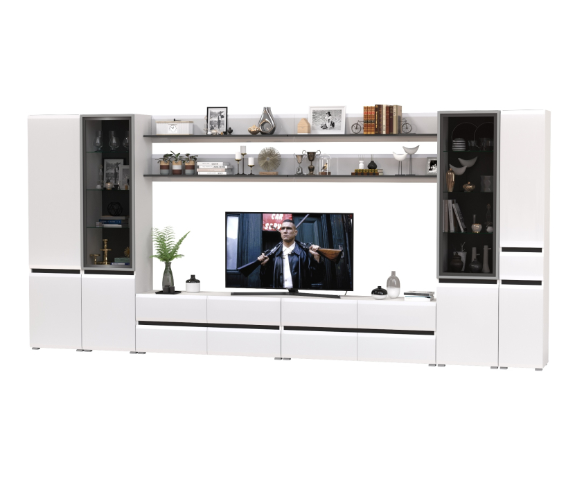 Комплектация состоит из двух тумб под ТВ Сидней 13.63, четырех полок открытых Сидней 16.486, шкафа с дверками Сидней 13.200, двух шкафов с фасадами стекло Сидней 13.201 и узкого шкафа с ящиком Сидней 13.202.